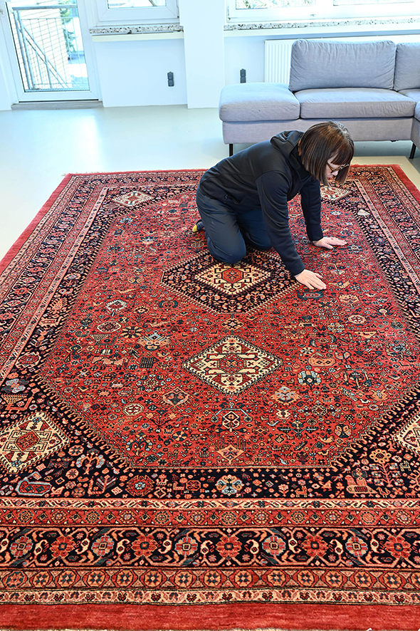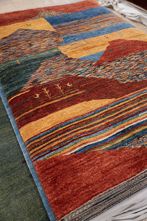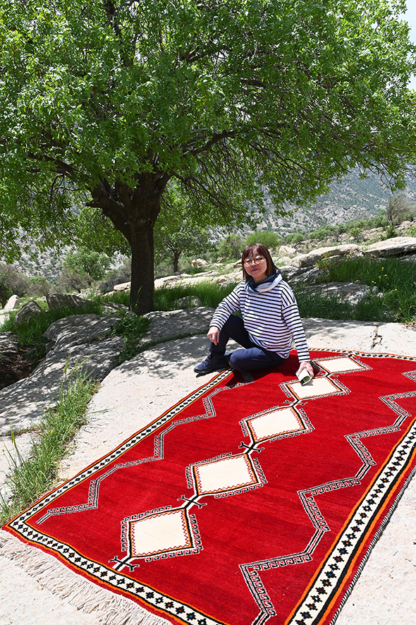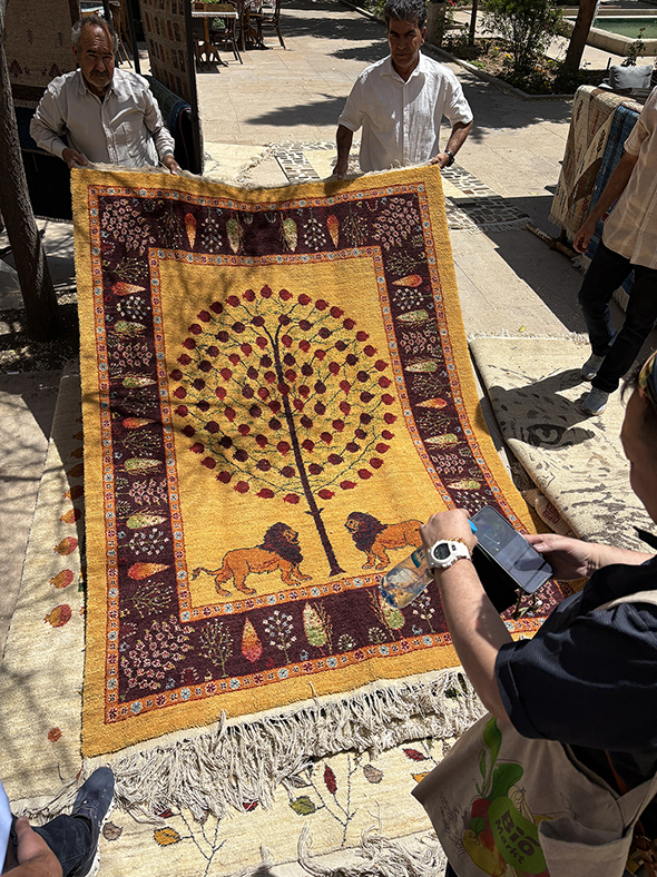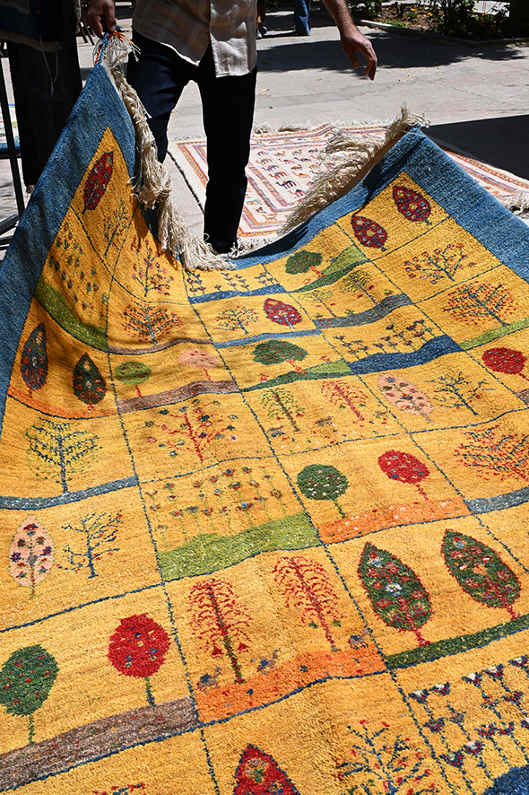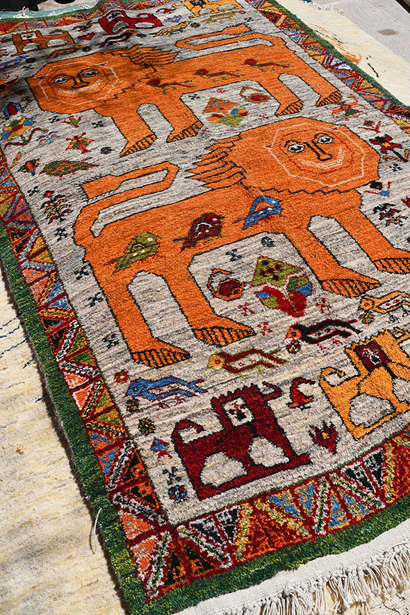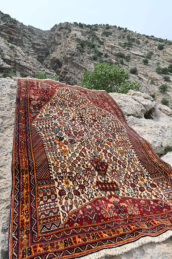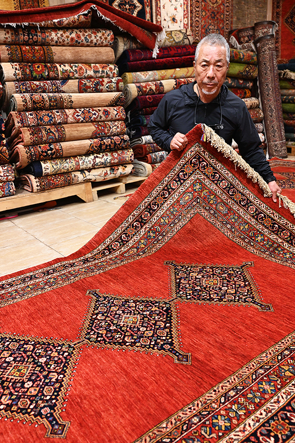 その後、イランへ入り、800km 北にあるテヘランまでミニバスでギャッベの宝物を探しながら北上。カシュガィ遊牧民居住区に近いシラーズのバザールでは、ギャッベ専門の店の奥に積んであるデッドストックを、全部店の前に出して並べてもらい、隅から隅まで探し尽くしました。また、中東最大のバザールがあるテヘランでは、「最高級のカシュクリ・クラシックのギャッベを扱う店」を発見。これまでに幾度となく訪れているバザールで、身体が震えるような興奮を覚えました。ギャッベを始めて20 年を過ぎて、まだまだ未知のものに出会う楽しさ! イランの絨毯の世界は奥が深いと感じます。興奮し充実したイランでの旅、自信をもって選んだギャッベの数々をギャラリーの顧客の皆様にご覧いただけたら嬉しいです。ご来館を心からお待ち申し上げます。