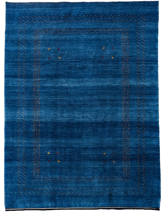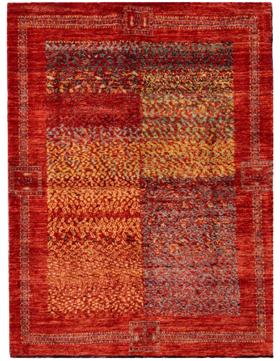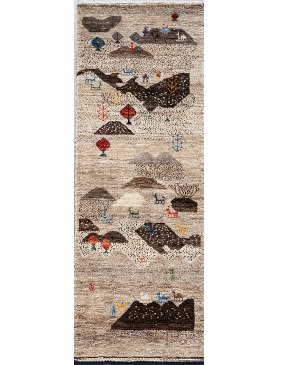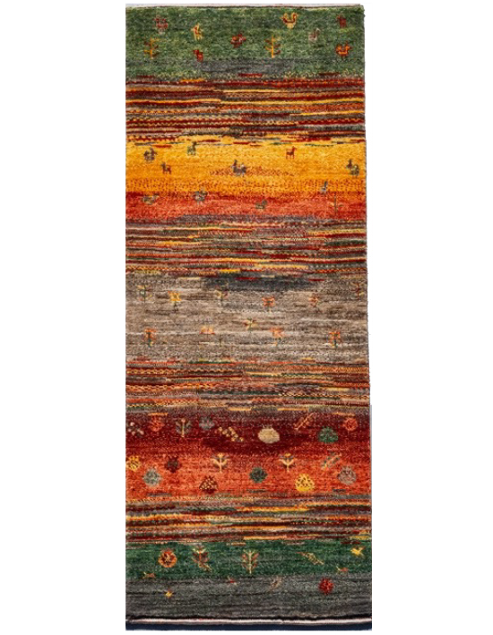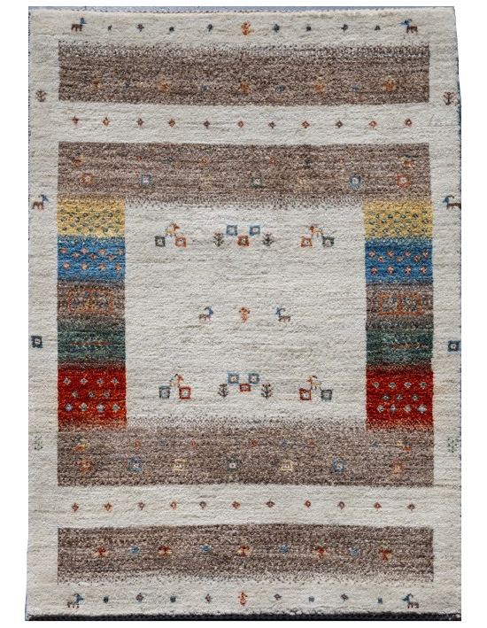 財産を意味する動物柄がところどころに入り、ギャッベの5大色(赤・青・黄・茶・白)をセンターに入れた織り手の楽しさが伝わる1枚。