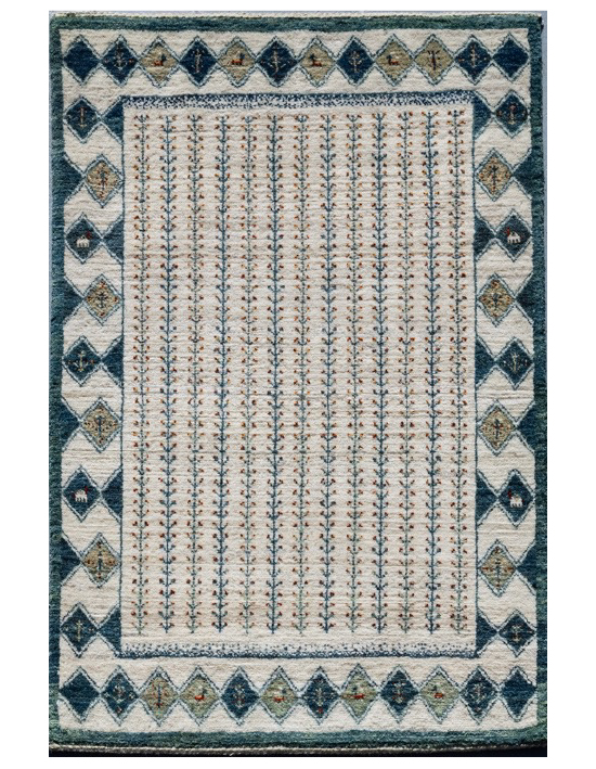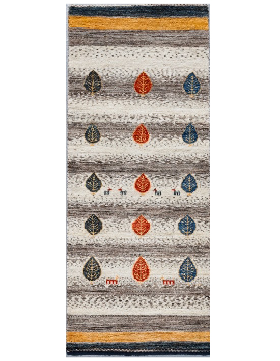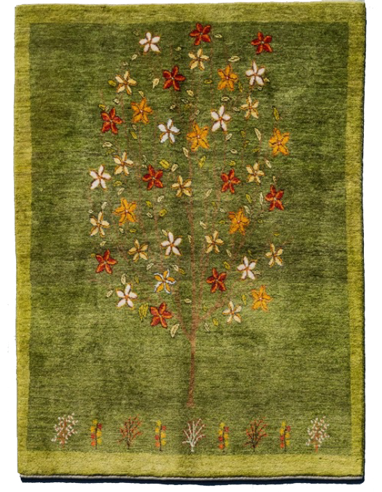 軽やかな生命の樹の文様のギャッベです。ボーダーの線が直線ではなく、ゆらぎがあったり、色むらに見える微妙な色あいが、ギャッベらしい優しさをもっている。