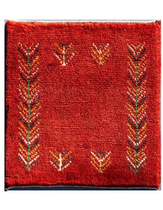 ギャッベの赤い色は茜という植物の根っこが染料。その茜に茶色を作るくるみを混ぜて、濃い赤を出したりしている。小さな玄関など向けの小さいサイズ。